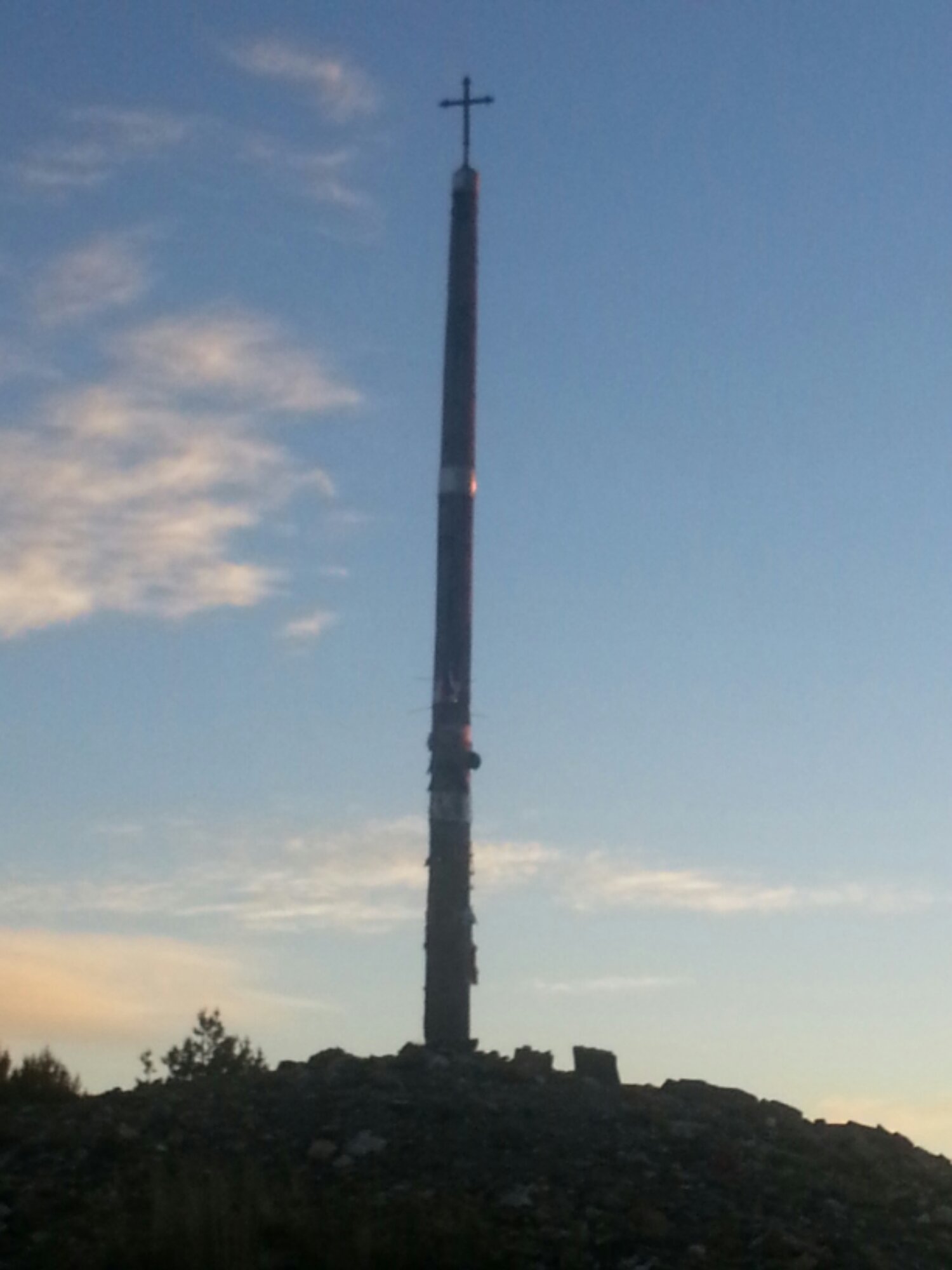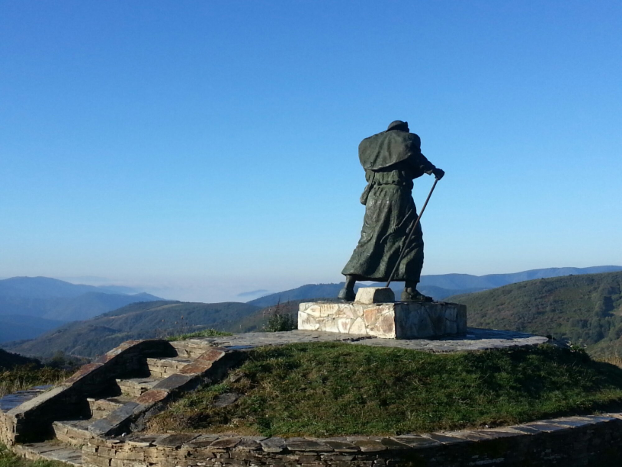 Cruz de Ferro. A famous landmark on the Camino, originally to help pilgrims find their way across the mountains. Traditionally each pilgrim adds a stone, bought from home, to the huge cairn below the cross